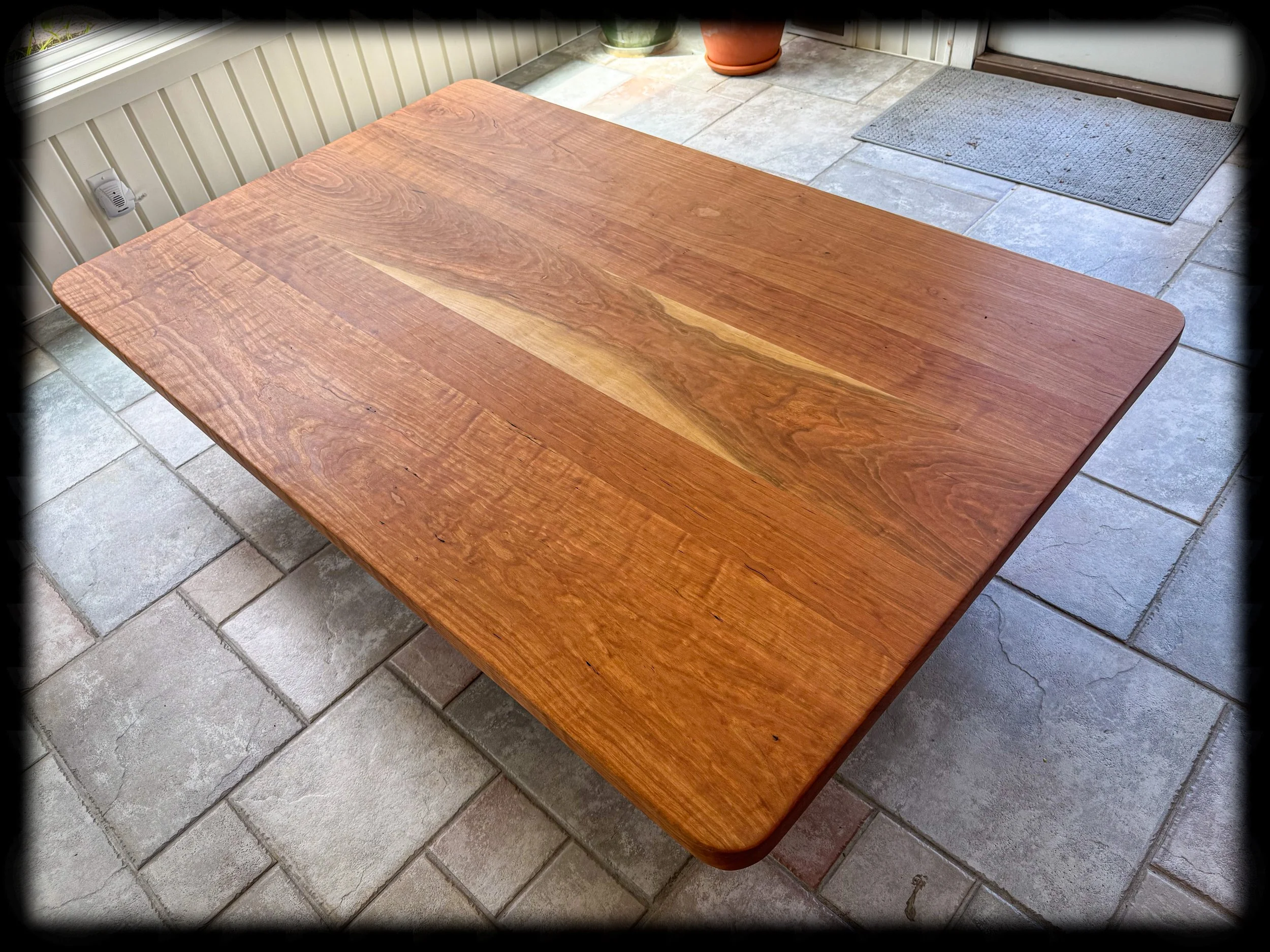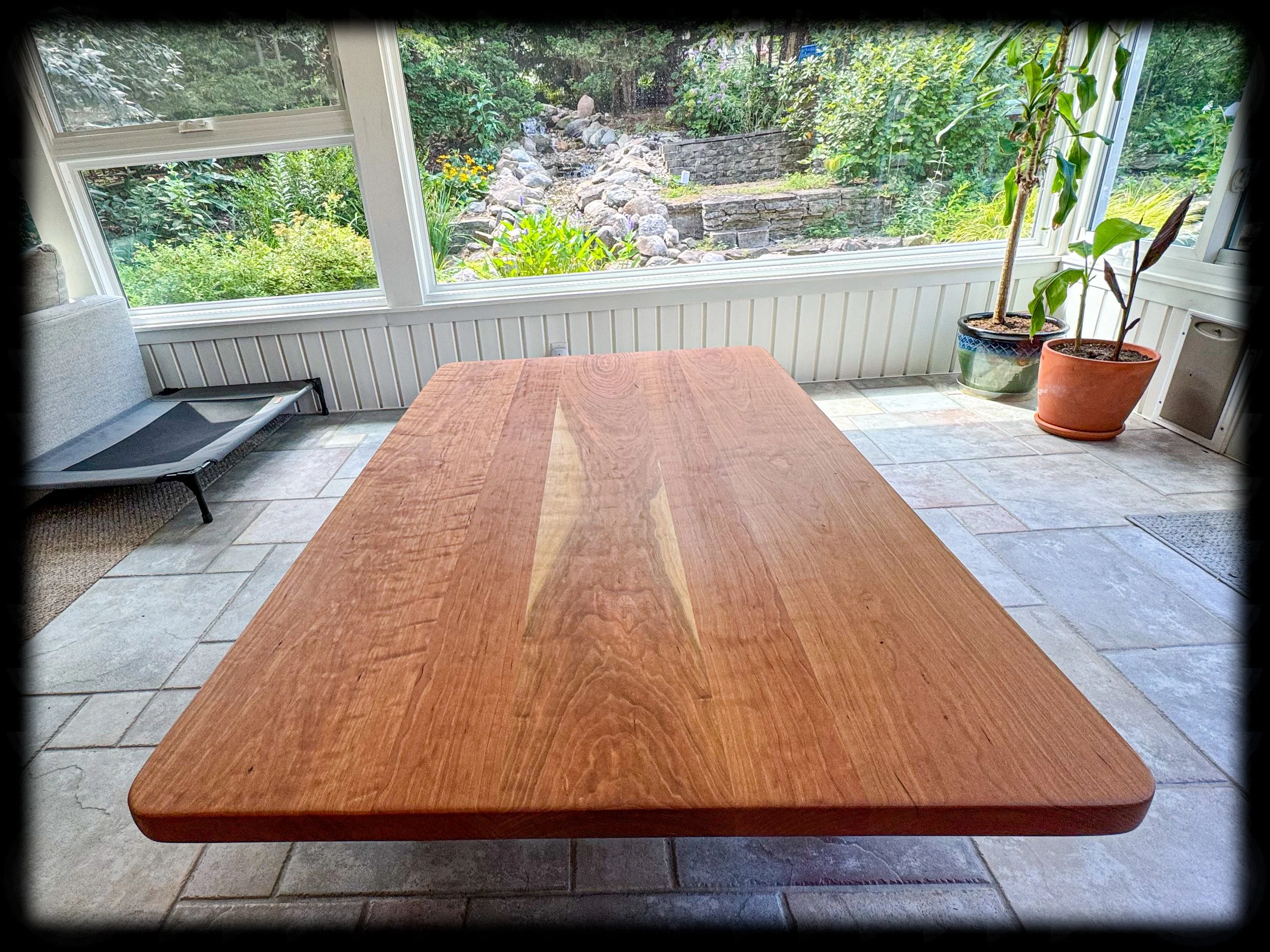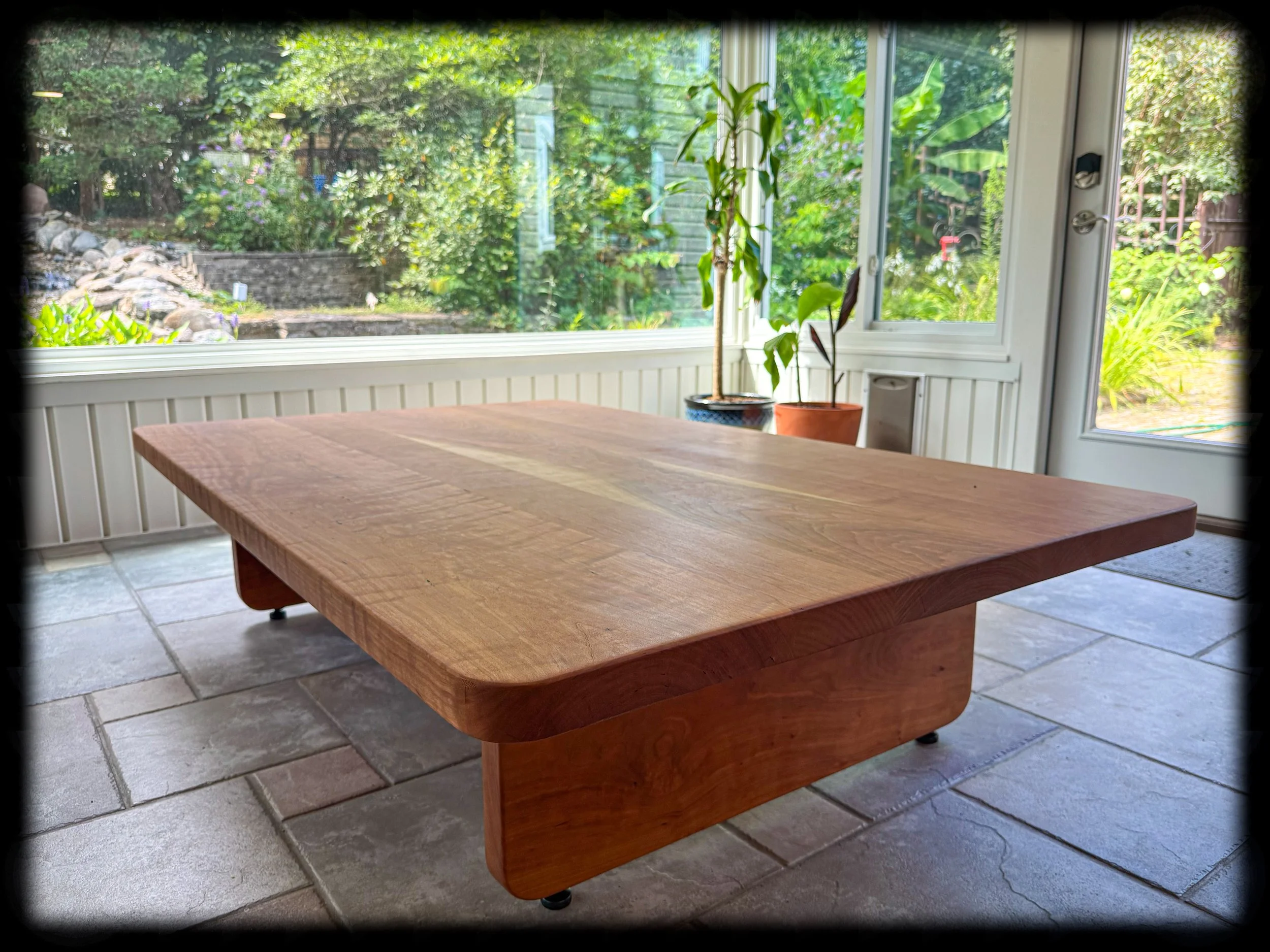 a bespoke Tatami/Chabudai table made from the wood of locally sourced Cherry Trees. It is a low-profile table designed for sitting on the floor and drinking tea, meditating, or eating pickles. Cherry blossoms connect with mindfulness and encourage living in the present moment, appreciating the beauty and fragility of life.