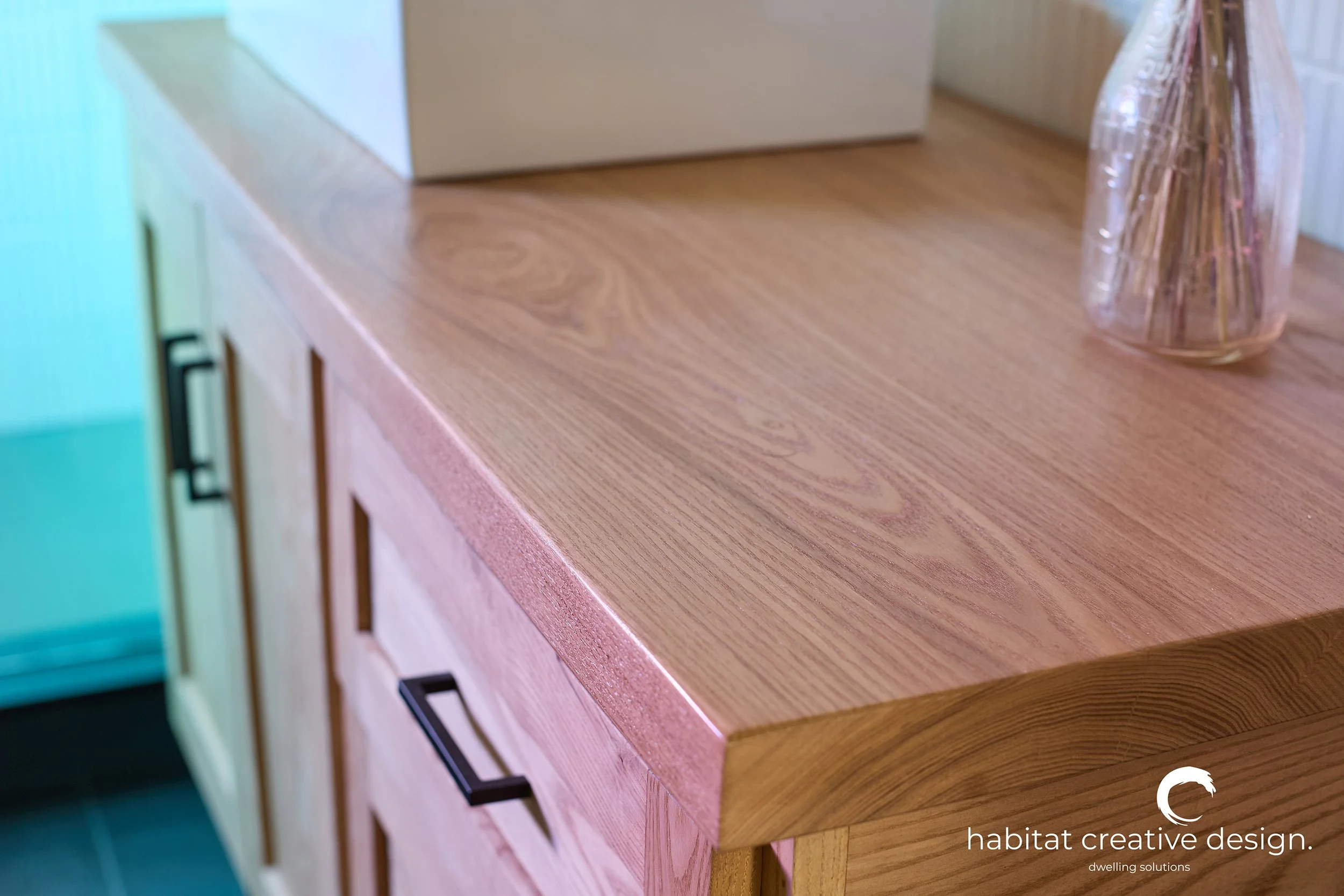a bespoke floating bathroom vanity made from solid locally-sourced Ash wood. The doors and drawer fronts were done in a shaker-style and the drawer boxes built with dovetail joinery. It named after Odin, the foremost god of the Vikings. Both he and Thor, the god of thunder, had magical spears made of Ash wood.